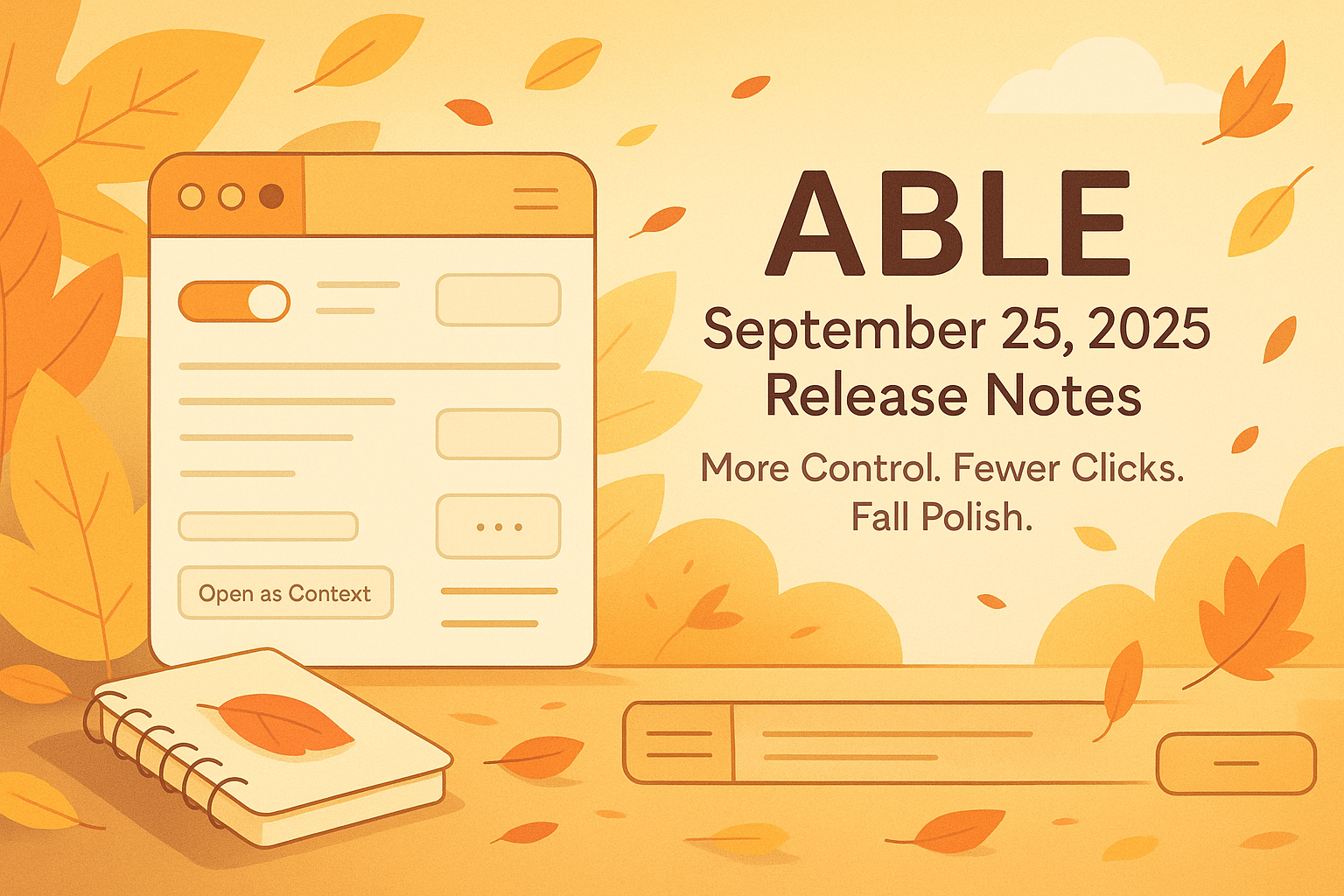 ABLE users, weโre back with another update โ one that gives you more control, flexibility, and power to shape your workspace exactly the way you need it. Whether itโs managing contexts, reorganizing your sidebar, or sharing setups with others, this release is all about giving you tools that reflect how you think and work.
