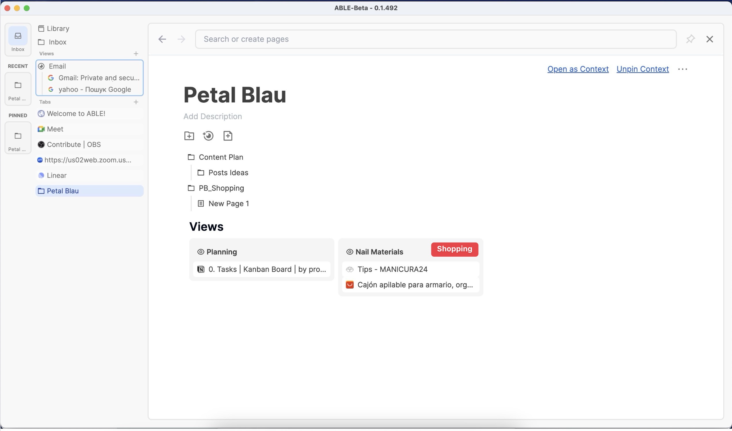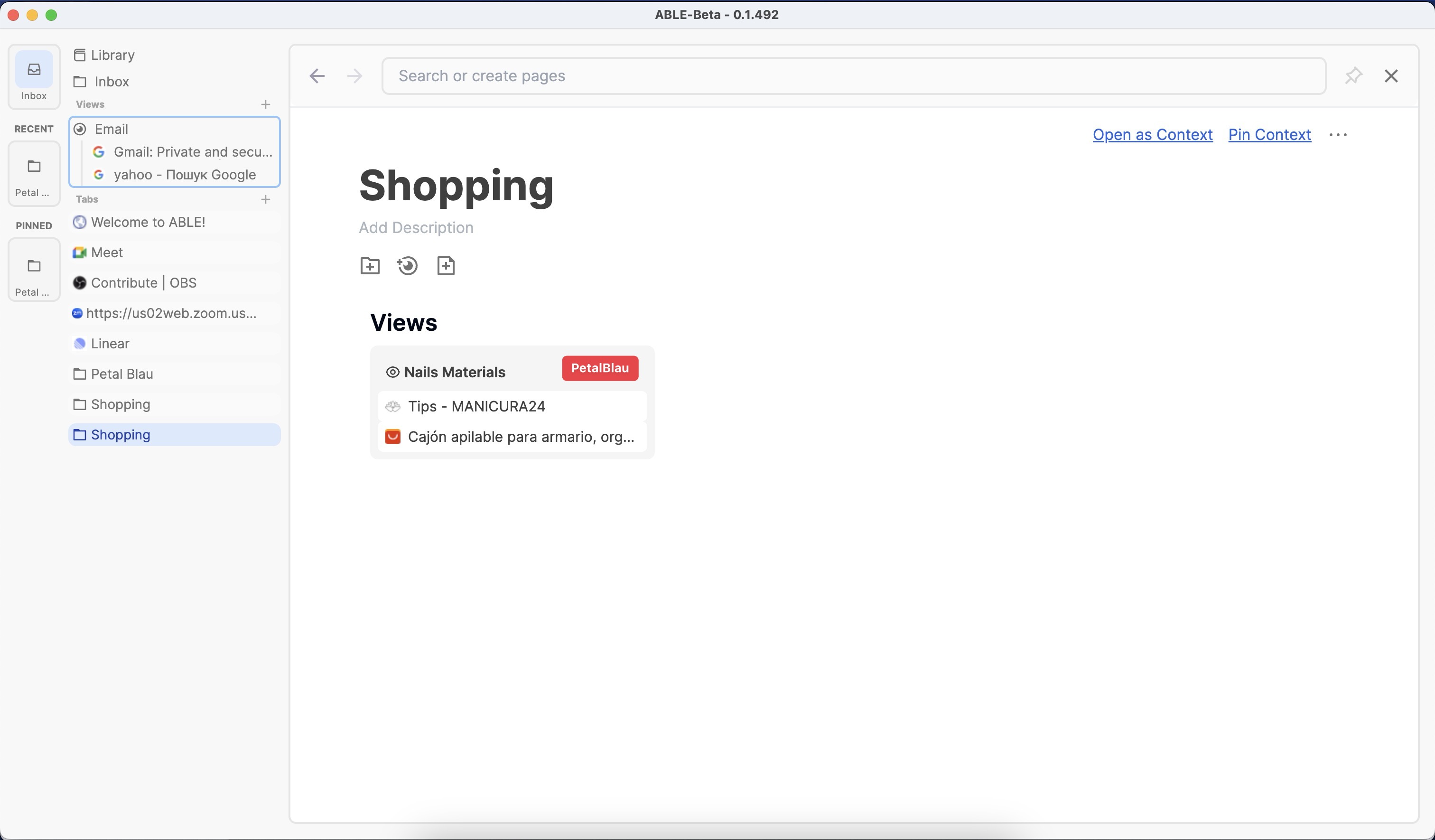 Currently, I manage shopping contexts for different purposes. For example, I have two folders: “PB_Shopping” for business-related purchases (like materials, subscriptions, tools for Petal Blau) and “Home_Shopping” for home-related purchases (decor, appliances, cleaning supplies, etc.). However, when I shop on platforms like Amazon, the shopping action itself is shared across contexts.